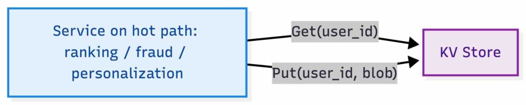 Let’s think of a realistic use case here. We might be a platform team running an online entity store for real-time production decisions. Services call it on the hot path to fetch small per-entity blobs keyed by something like user_id, device_id, or item_id, for example feature vectors for ranking, user state for personalization, fraud signals, entitlement state, or request metadata needed to make a decision in a single network round trip. Some real deployments also need TTL, but for this exercise we keep the contract to just Get and Put and treat expiration as out of scope.