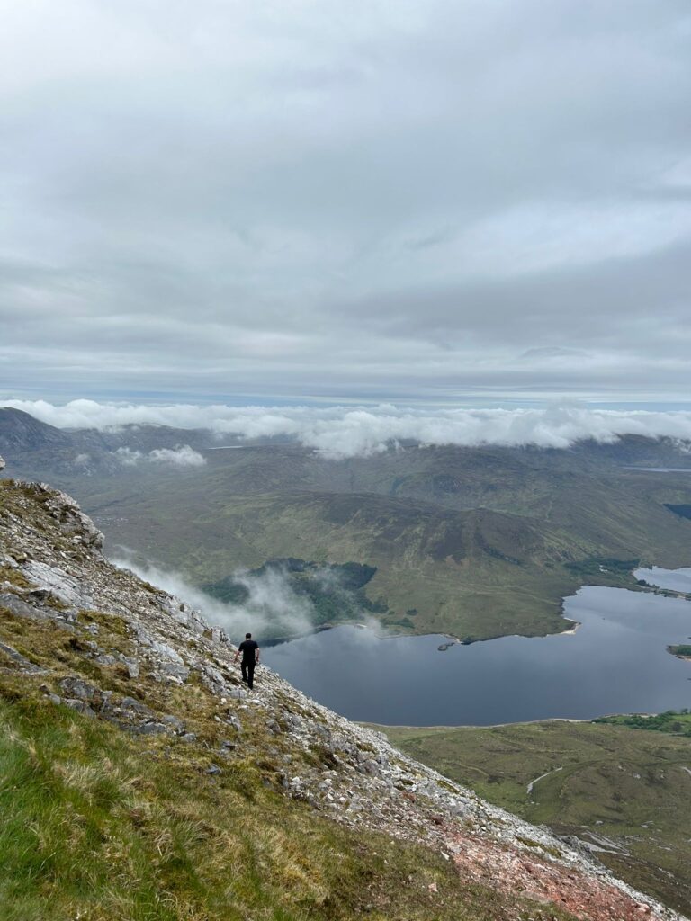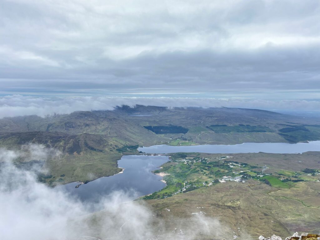 The trip began with a peaceful drive to Letterkenny, where we arrived at 10:00 pm to rest up for the next day's activities. The foggy morning greeted us as we left for Errigal Mountain at 8:30 am. The mountain was covered in a dense fog, adding an air of mystique to our journey. The group followed a steady trail, while I decided to challenge myself with mountain running.