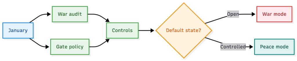 That is war mode at the org level. Uncontrolled access. Peace mode is again designed. It looks like simple gate policies: