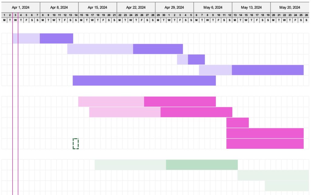 For steering multi-team/org projects, using tools like Gantt charts for timeline tracking is necessary. Think of a Gantt chart as the navigator’s map for our fleet. It doesn’t just show the route but also highlights how each ship moves in relation to the others. It ensures that all parts of the project fleet are aligned and moving at the right pace, reducing the chances of collision or getting off course. Especially for very large projects, where the complexity can be overwhelming, Gantt charts provide a clear, visual structure to manage timelines, dependencies, and milestones. They make it easier to spot potential delays before they happen and adjust the sails accordingly, keeping the entire fleet on a steady course towards the project's destination.