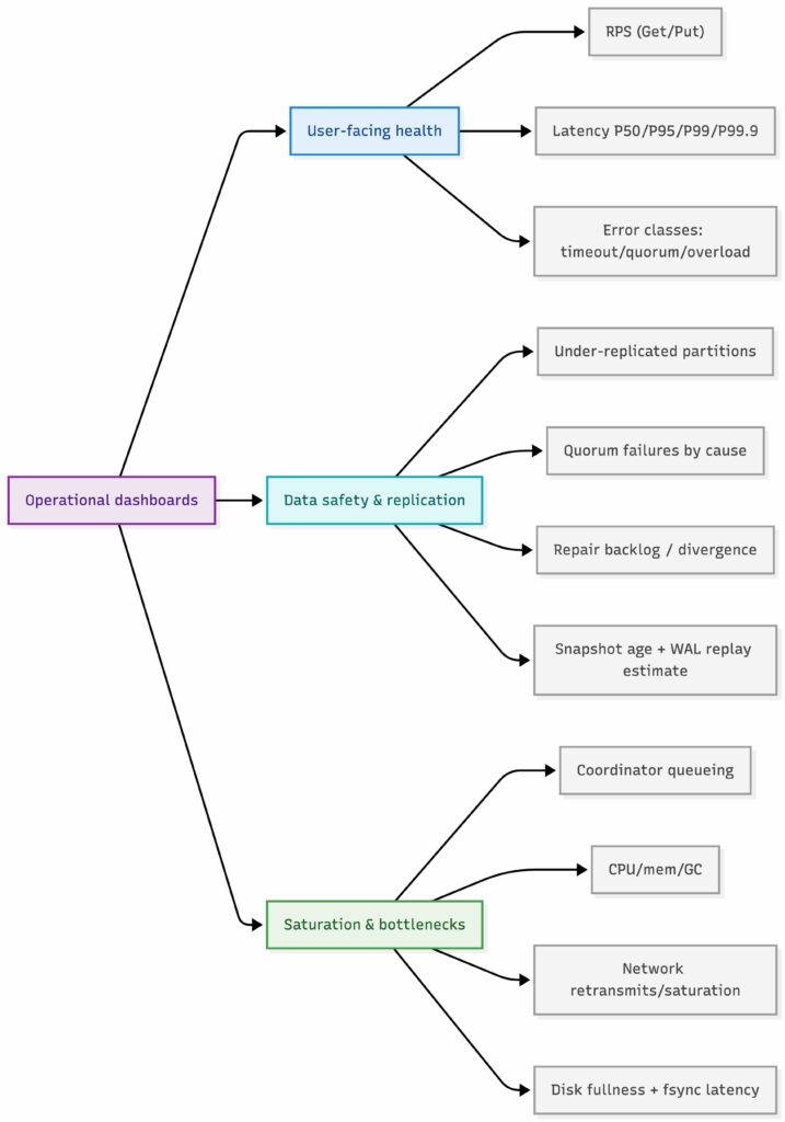 - Error rate by class, including timeouts, quorum failures, overload rejections, and client-side errors, because each points to a different failure mode.