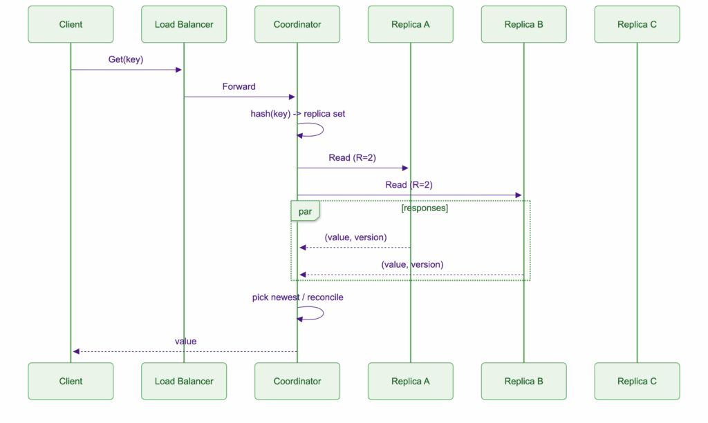 - Reads: if we do quorum reads (R=2), each Get fans out to 3 replicas even if we need 2 acks because that’d help with tail latency.